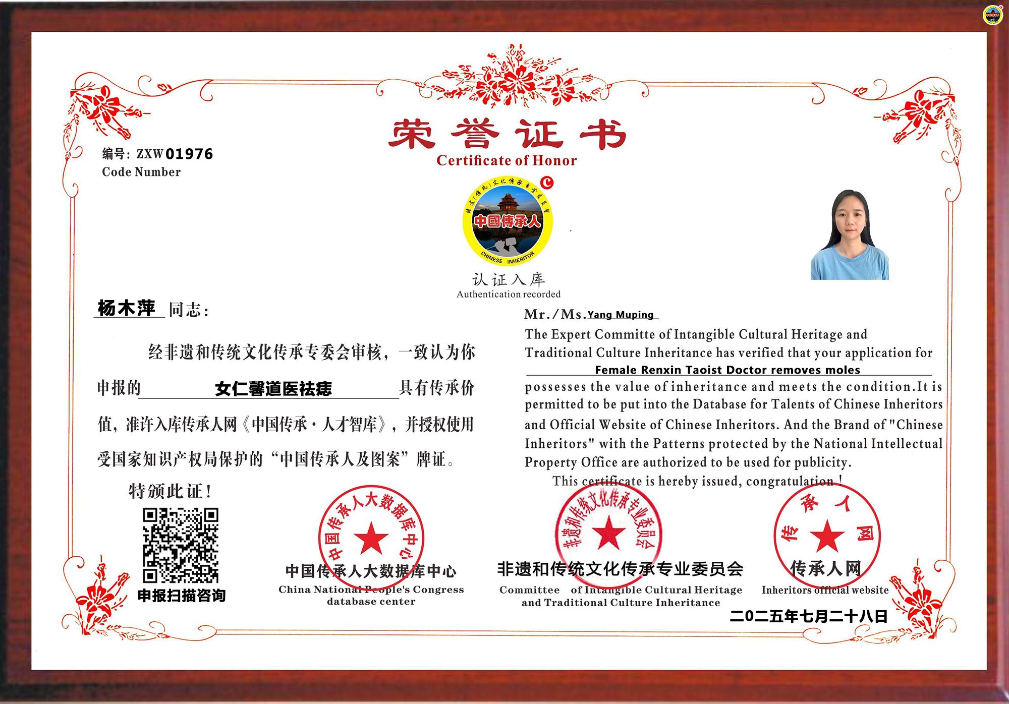 传承人网公示:2025年11月06日,广东省云浮市杨木萍同志申报的“女仁馨道医祛痣”具有传承价值,准许入库《传承人网·人才智库》。
