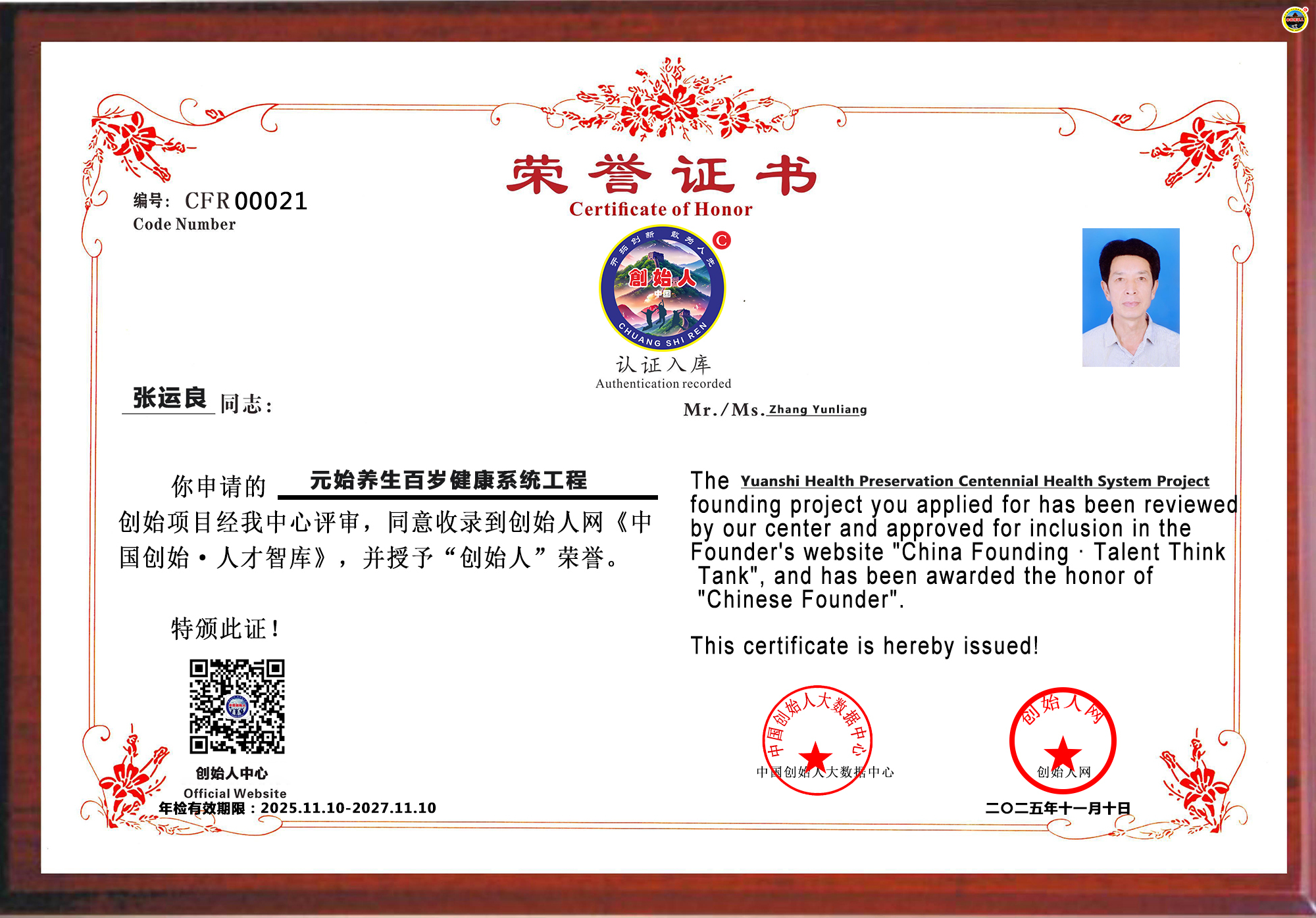 创始人网:2026 年01月04日,经中国创始人大数据中心审核,同意河北省石家庄市张运良同志申报的“元始养生百岁健康系统工程”独创项目入库创始人网《中国创始·人才智库》,并颁发“中国创始人”入库荣誉牌证。