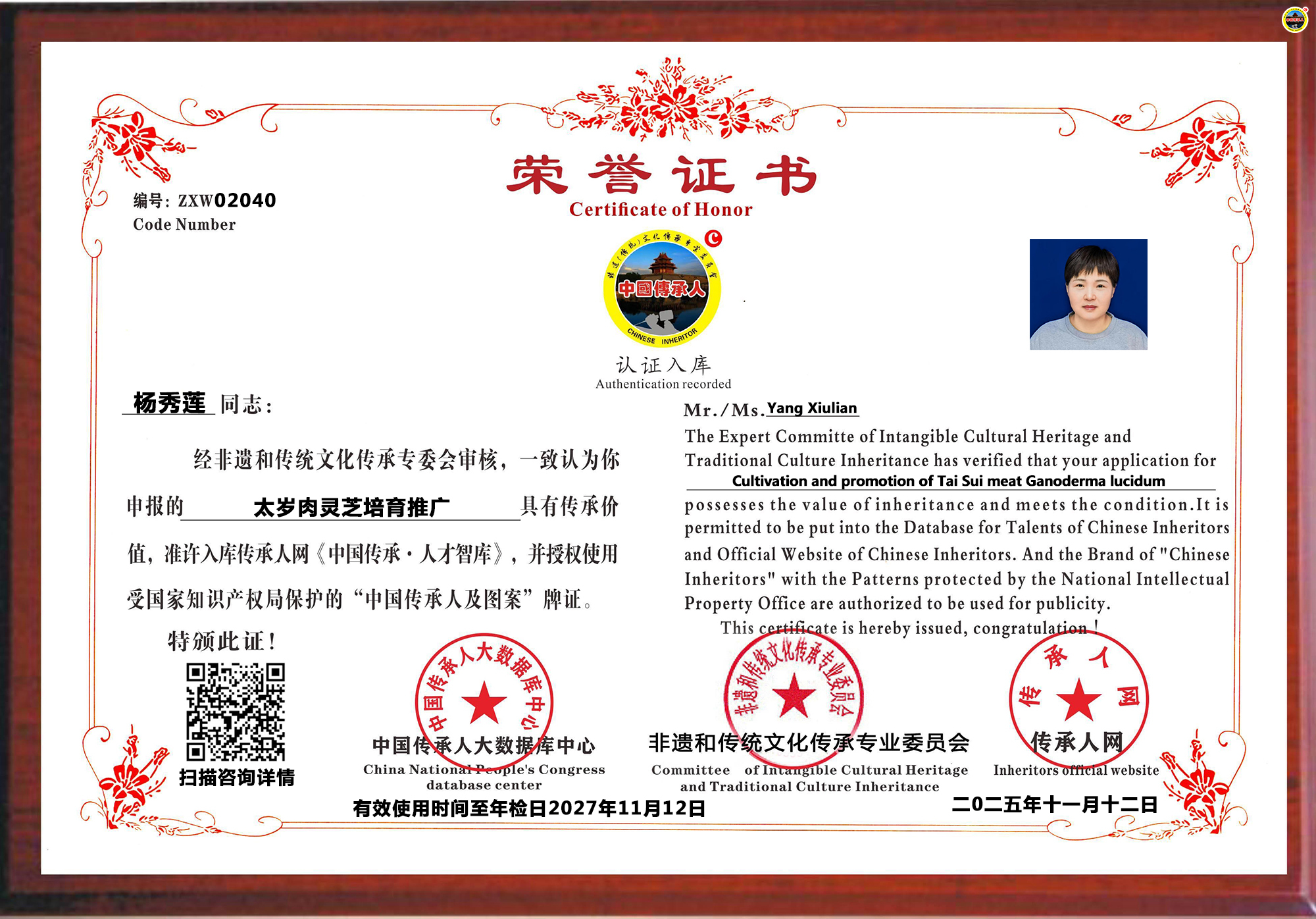传承人网公示:2025年12月15日,河南省商丘市杨秀莲同志申报的“太岁肉灵芝培育推广”具有传承价值,准许入库《传承人网·人才智库》,并授权使用受知识产权保护“中国传承人”入库荣誉牌证。