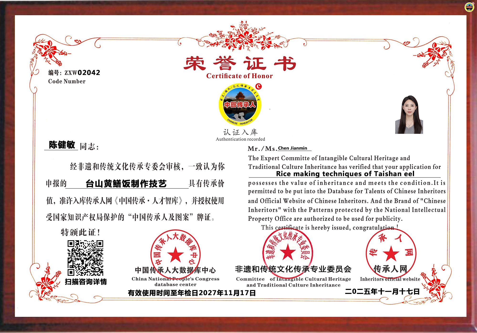 传承人网公示:2025年12月16日,广东省江门市陈健敏同志申报的“台山黄鳝饭制作技艺”具有传承价值,准许入库传承人网《中国传承·人才智库》,并授权使用受知识产权保护“中国传承人”入库荣誉牌证。
