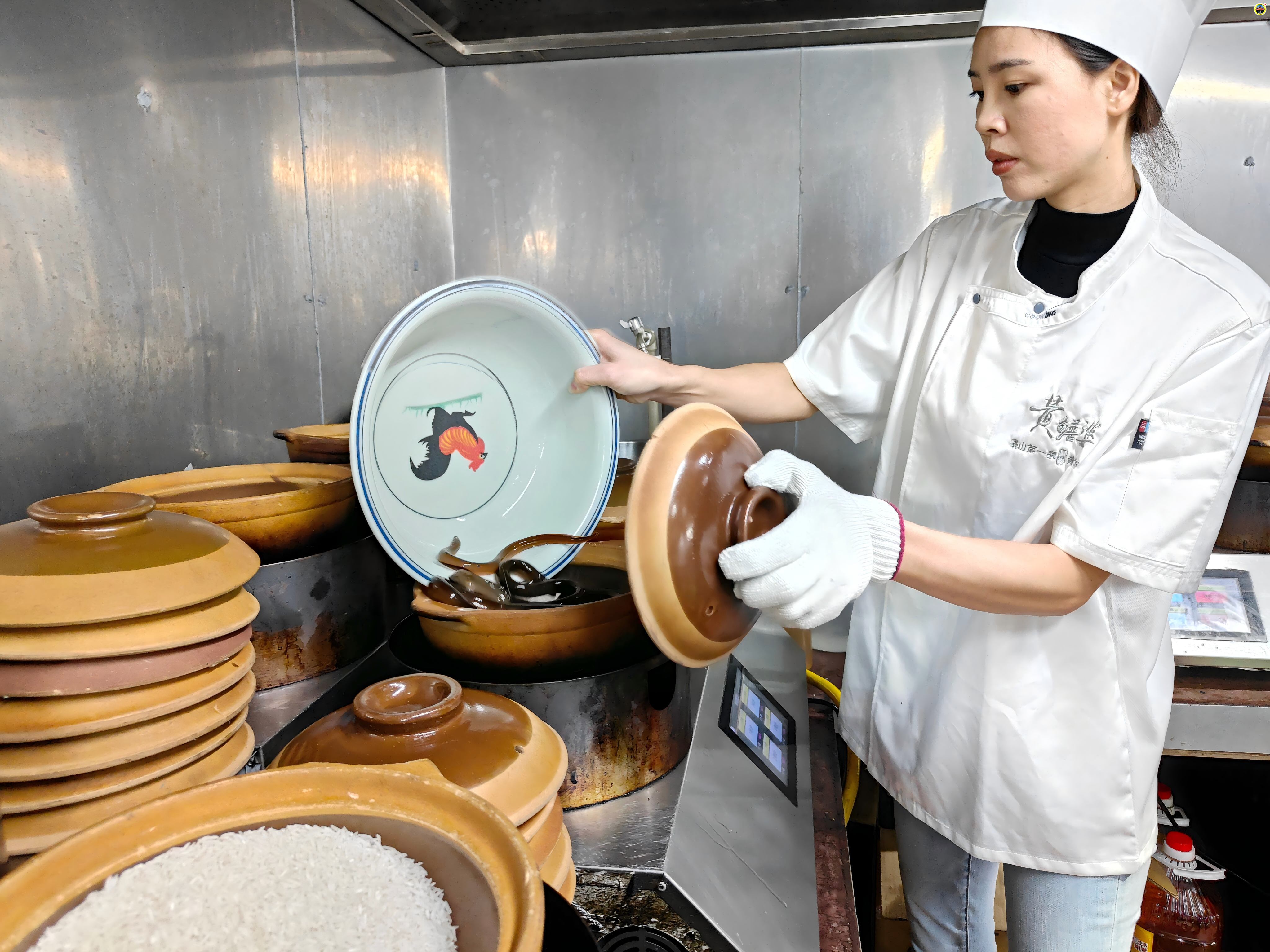 2023 年 9 月,她正式向"台山第一家兴华黄鳝饭店"创始人彭日华、 谭小霞夫妇学习传统的台山黄鳝饭技艺,谭小霞见她手快、心细、肯学, 便倾囊相授:从选鳝到去骨到翻炒一丝不苟,制作时采用传统的瓦煲, 以本地黄鳝和优质大米为原料,先将黄鳝放入瓦煲连同米粒一起蒸熟, 然后取出去骨,把鳝肉撕好。再把撕好的黄鳝放入饭面,放入锅中快炒添香。其传统的烹饪手法令黄鳝饭油而不腻、软硬适中、香气四溢,让人垂涎欲滴,成为一道普罗大众追捧的传统特色美食。