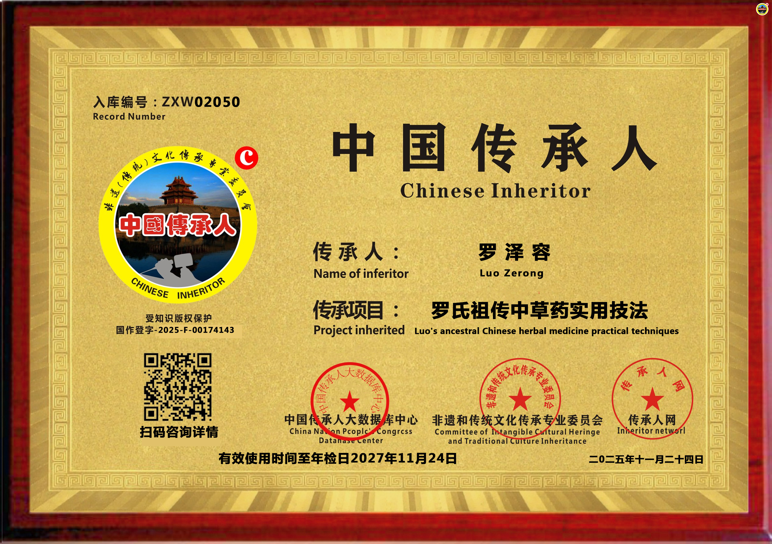 传承人网公示:2025年12月22日,重庆市罗泽容同志申报的“罗氏祖传中草药实用技法”具有传承价值,准许入库传承人网《中国传承·人才智库》,并授权使用受知识产权保护“中国传承人”入库荣誉牌证。