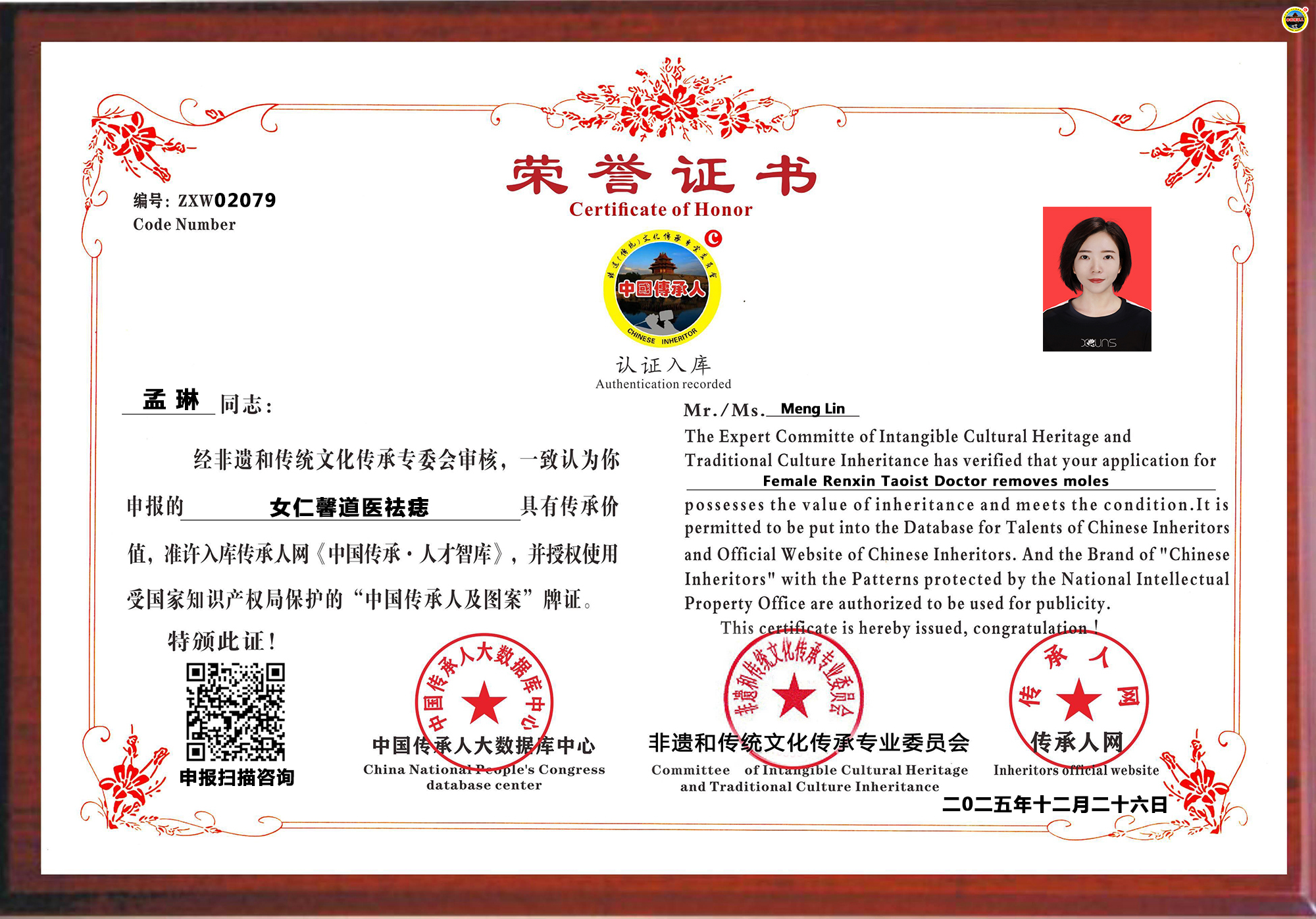 为了更好地将传统技艺与现代规范相结合,孟琳积极参加国家统一组织的技术考试,并凭借扎实的理论功底与精湛的实操技能,成功获得“高级祛痣师”专业认证,为其传承之路增添了权威背书。