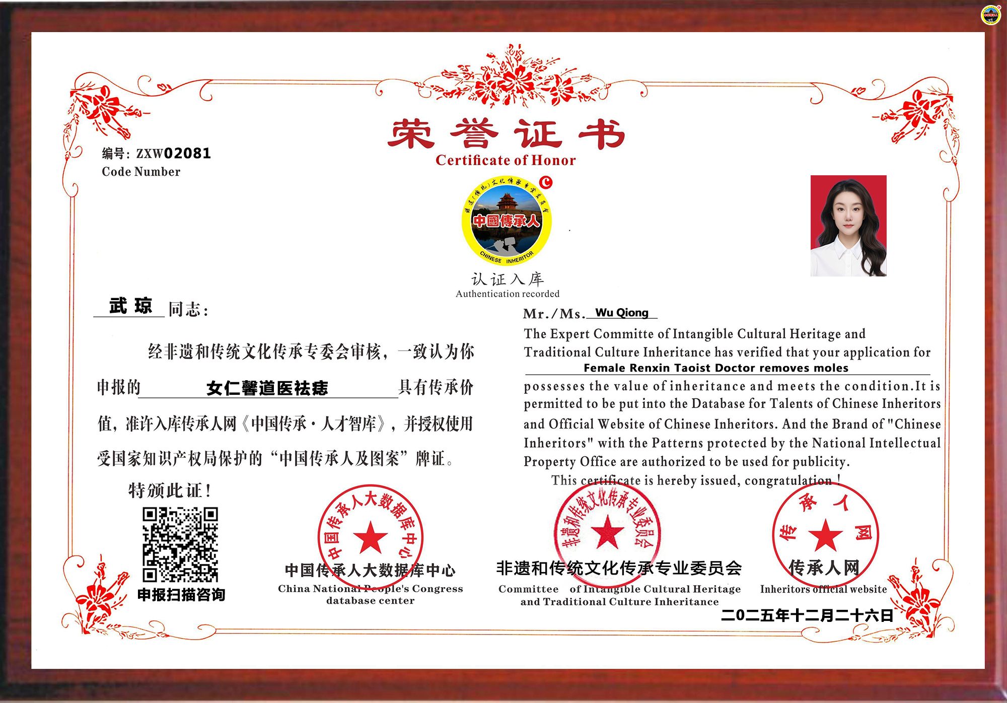 传承人网公示:2026年01月21日,山西省长治市武琼同志申报的“女仁馨道医祛痣”具有传承价值,准许入库《传承人网·人才智库》,并授予受国家知识版权局保护的"中国传承人"入库荣誉牌证。