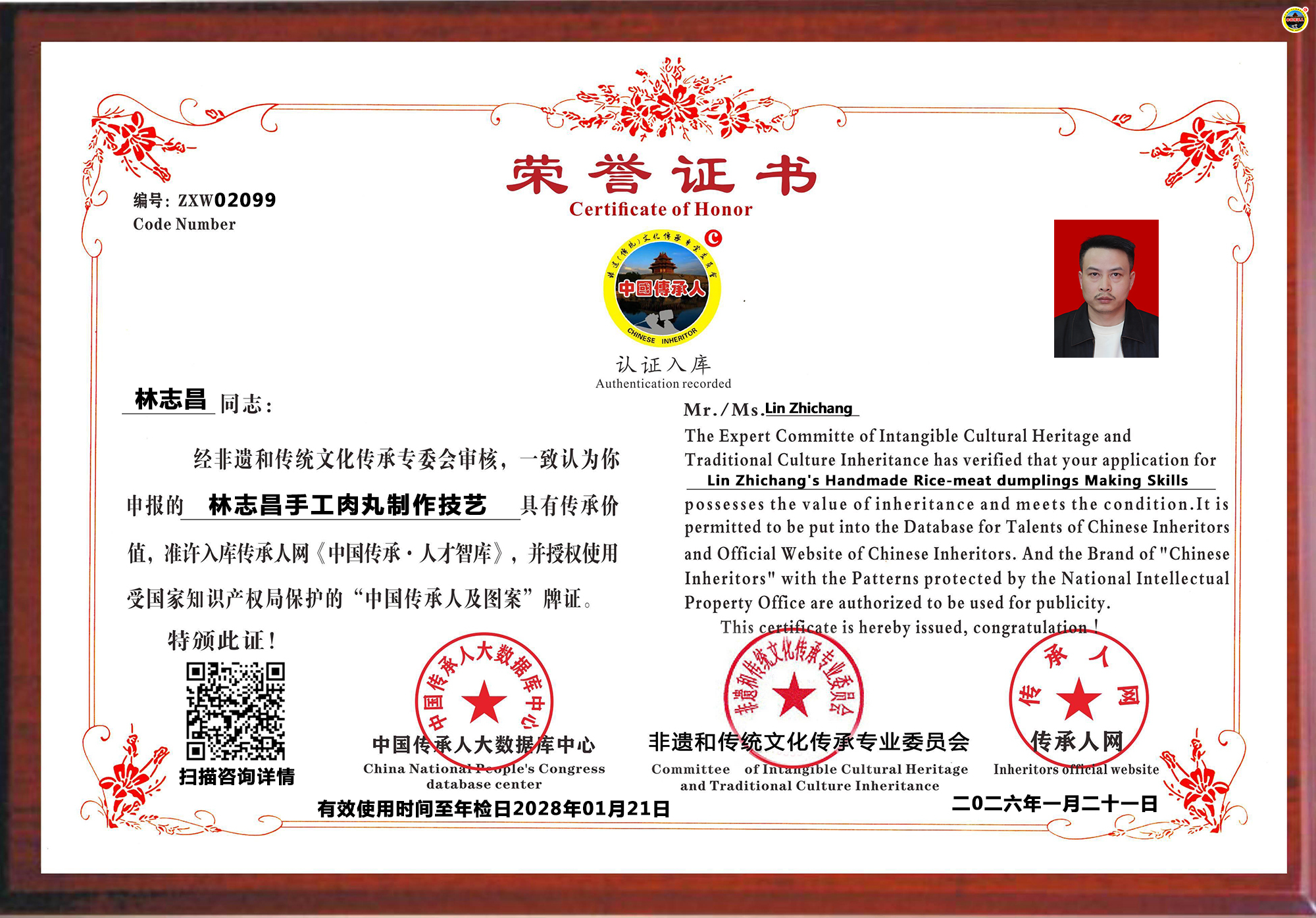 传承人网公示:2026年01月21日,福建省泉州市林志昌同志申报的“林志昌手工肉丸制作技艺”具有传承价值,准许入库《传承人网·人才智库》,并授予受国家知识版权局保护的“中国传承人”入库荣誉牌证。
