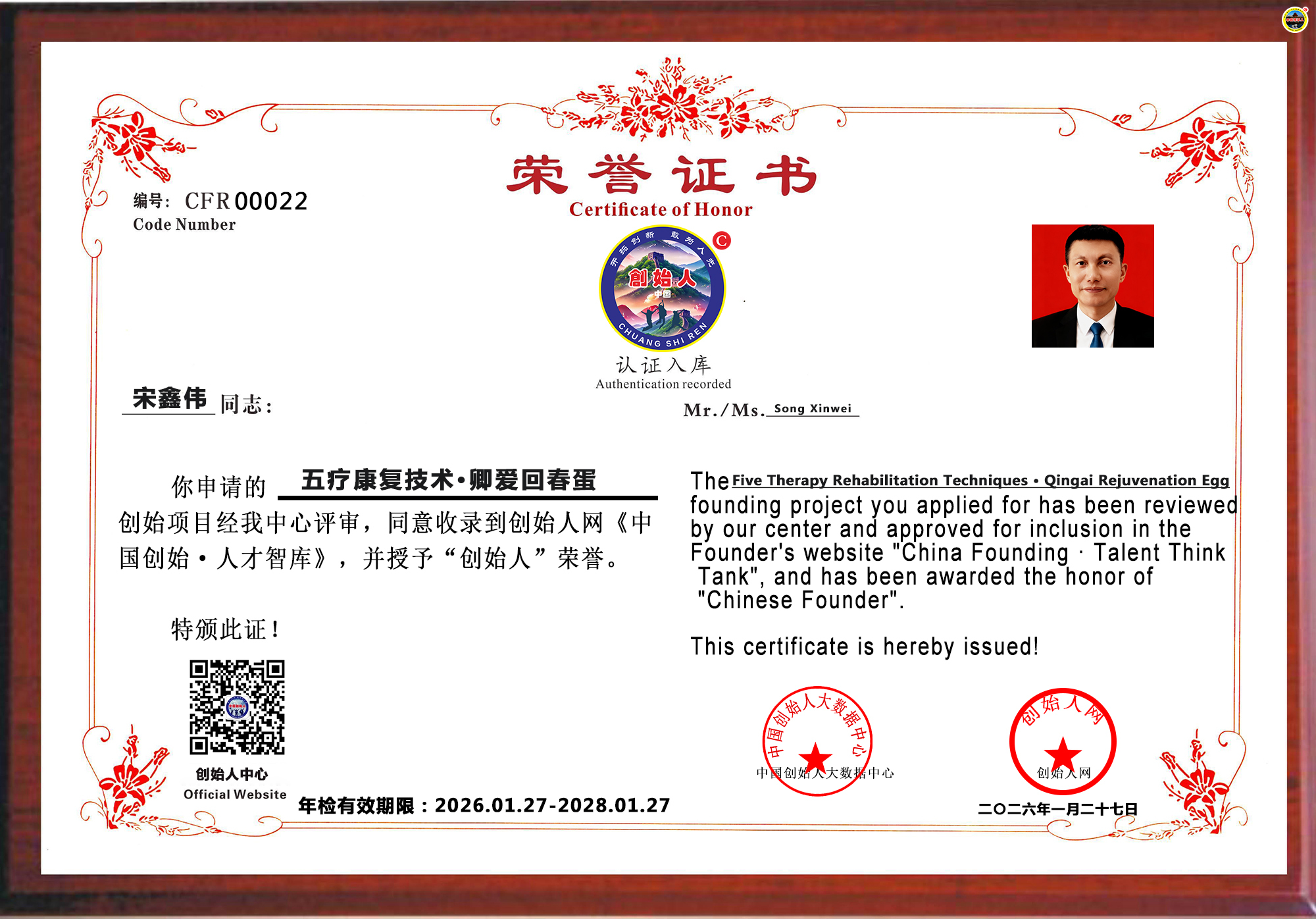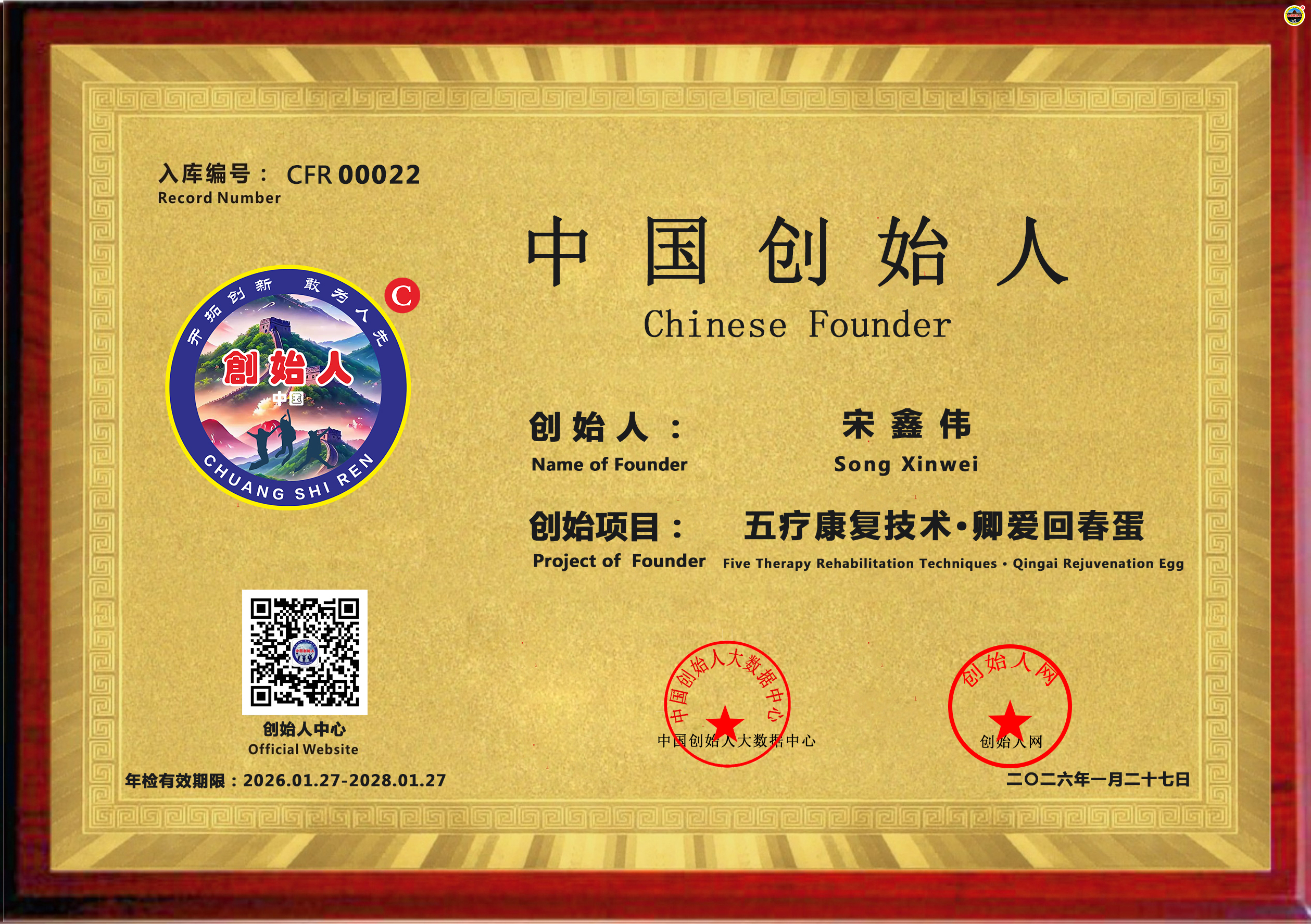 创始人网:2026 年01月27日,经中国创始人大数据中心审核,同意重庆市宋鑫伟同志申报的“五疗康复技术·卿爱回春蛋”独创项目入库创始人网《中国创始·人才智库》,并颁发“中国创始人”入库荣誉牌证。