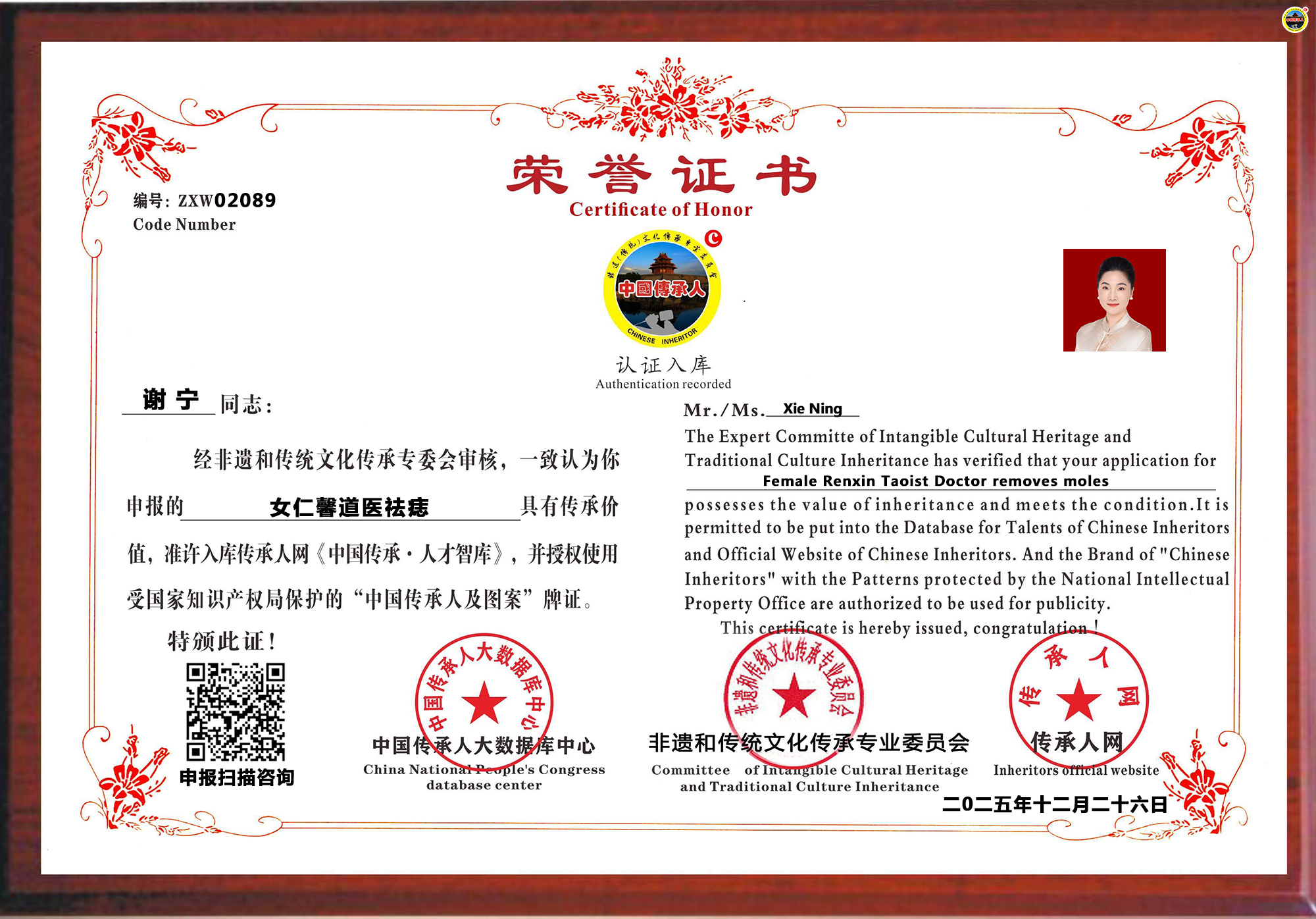 谢宁,女,出生于广西南宁,自2025年起正式拜入女仁馨道医祛痣创始人王良娟门下,她以大专学历的扎实基础与数年潜心研习,将中医古法与现代科技相融合,在守护传统技艺的同时,为现代人解决皮肤色素问题开辟了新路径。