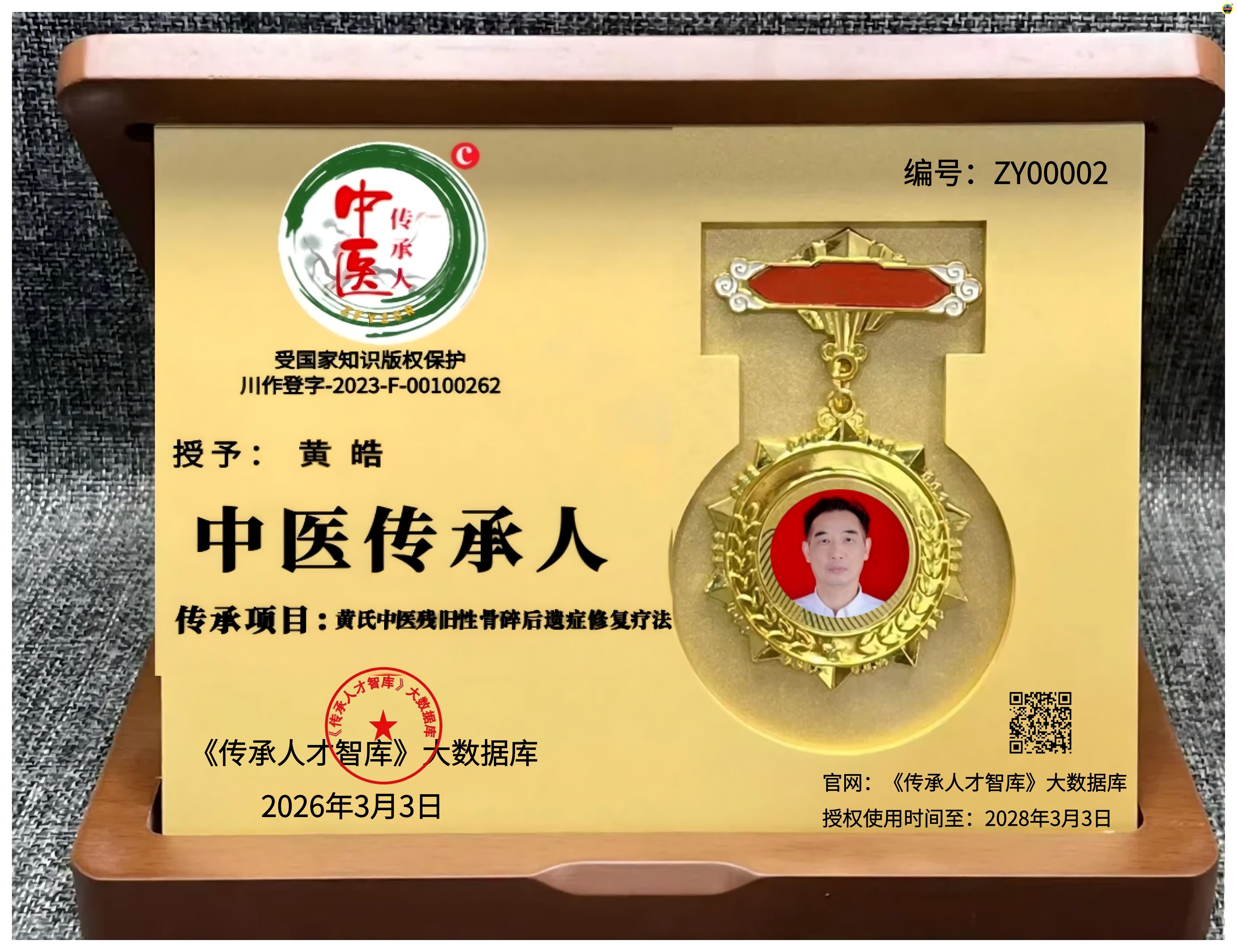 传承人才智库:广西壮族自治区南宁市黄皓同志申报的“黄氏中医残旧性骨碎后遗症修复疗法”获得“中医传承人”殊荣。这一殊荣不仅是对黄皓在推动中医文化方面所做贡献的认可,也标志着他在传统中医领域迈出了重要的一步。
