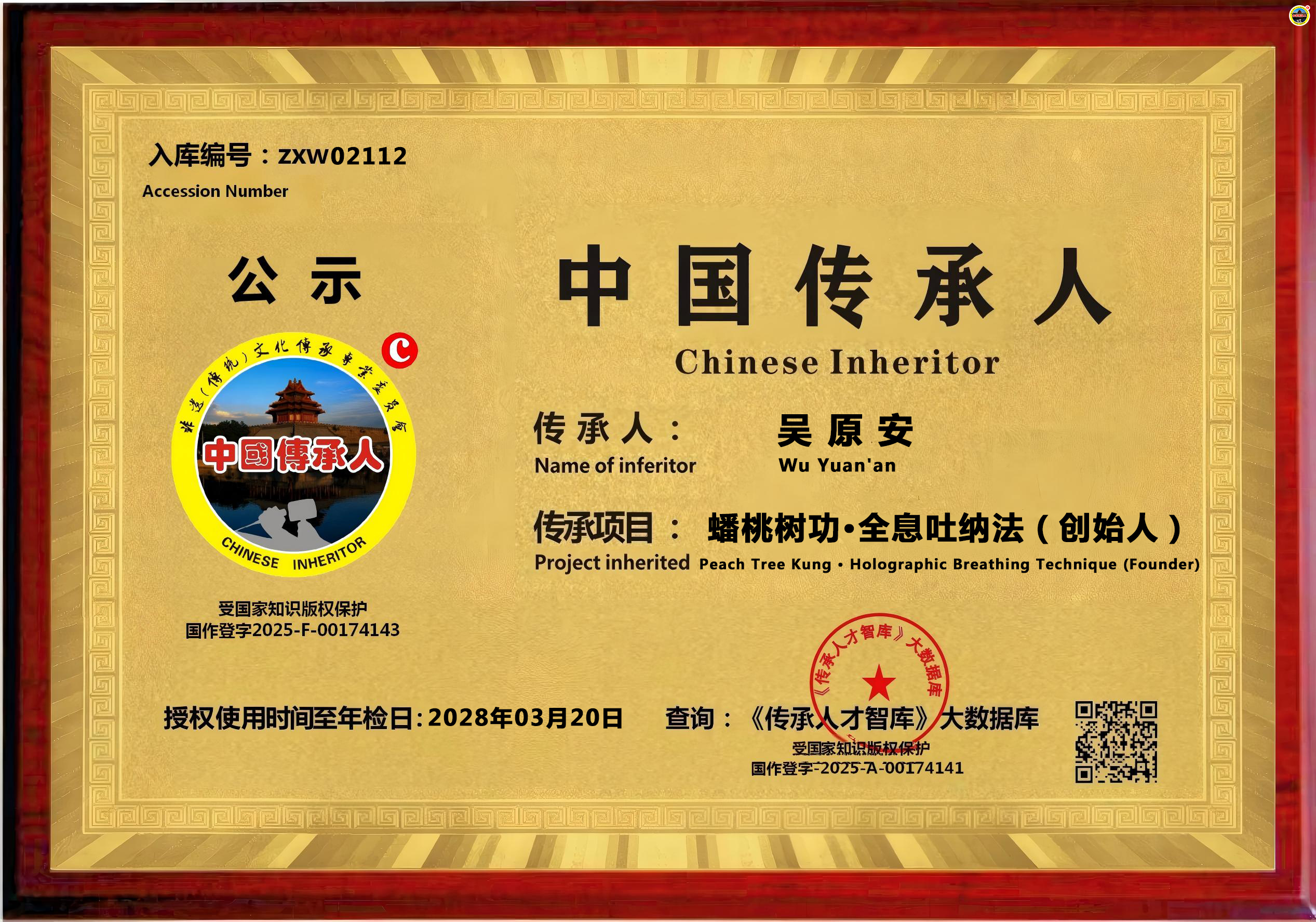 《传承人才智库》公示:2026年03月20日,福建省厦门市吴原安同志申报的“蟠桃树功·全息吐纳法(创始人)”具有传承价值,准许入库受国家知识版权保护的《传承人才智库》大数据库。